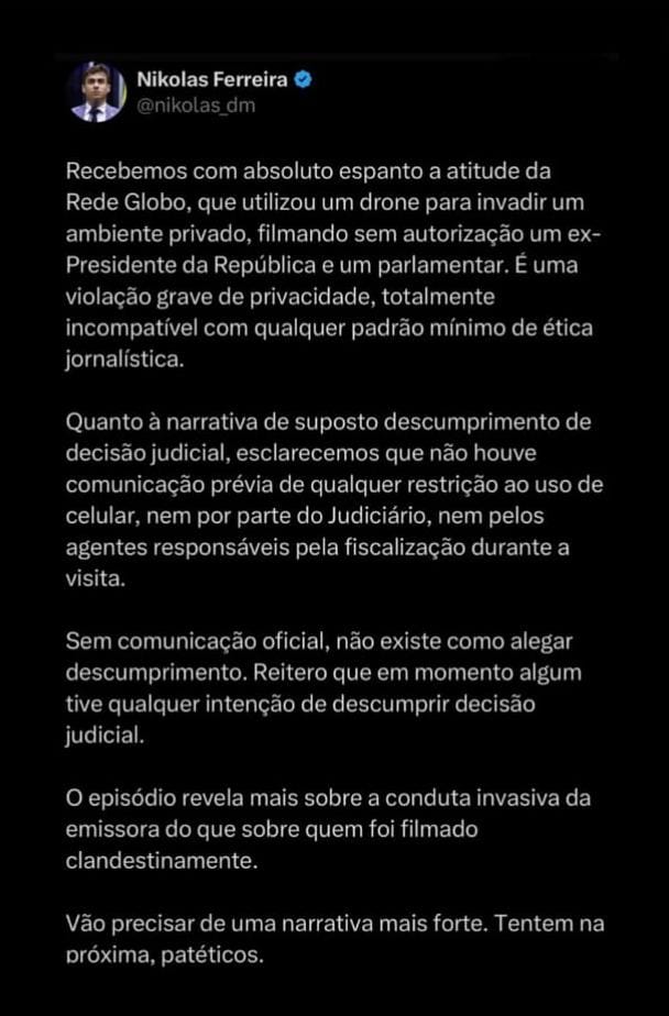 O deputado federal Nikolas Ferreira (PL-MG) criticou a TV Globo após a emissora utilizar um drone para registrar sua visita ao ex-presidente Jair Bolsonaro. Segundo ele, o equipamento sobrevoou uma área privada sem autorização, caracterizando o que chamou de grave violação de privacidade.
