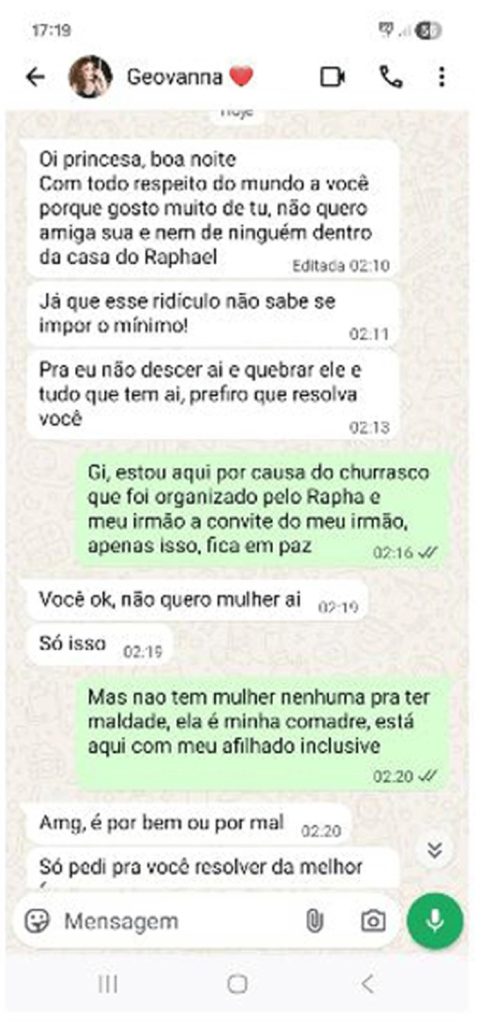 Pouco antes do crime, Geovanna enviou mensagens exigindo que outras mulheres fossem expulsas do churrasco. Nos textos, afirmou que iria até o local “resolver a situação” e fez ameaças diretas, dizendo que não haveria conversa.