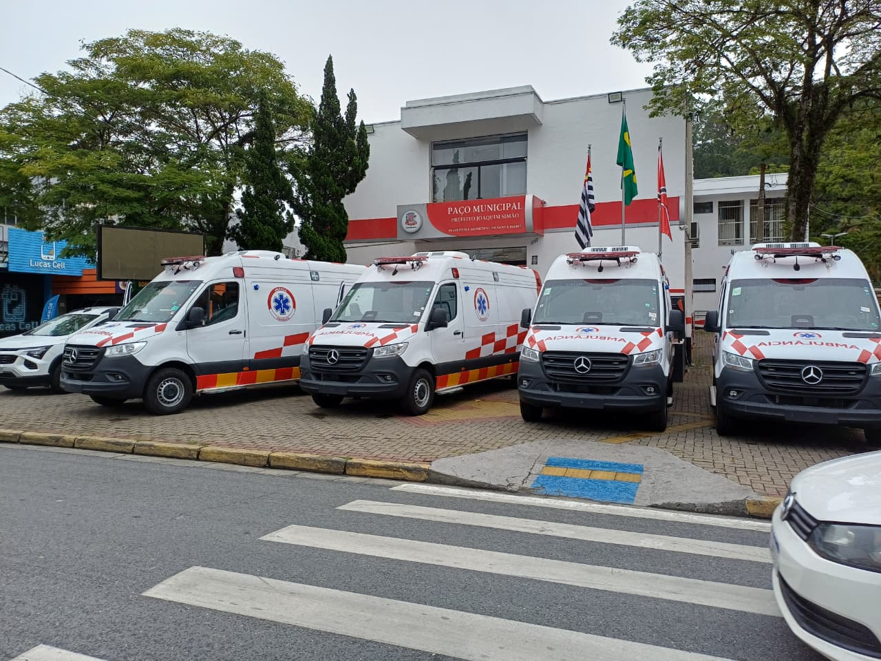 Foram adquiridas quatro novas ambulâncias de porte grande, zero quilômetro, totalmente equipadas para dar suporte às altas, internações e transferências hospitalares.