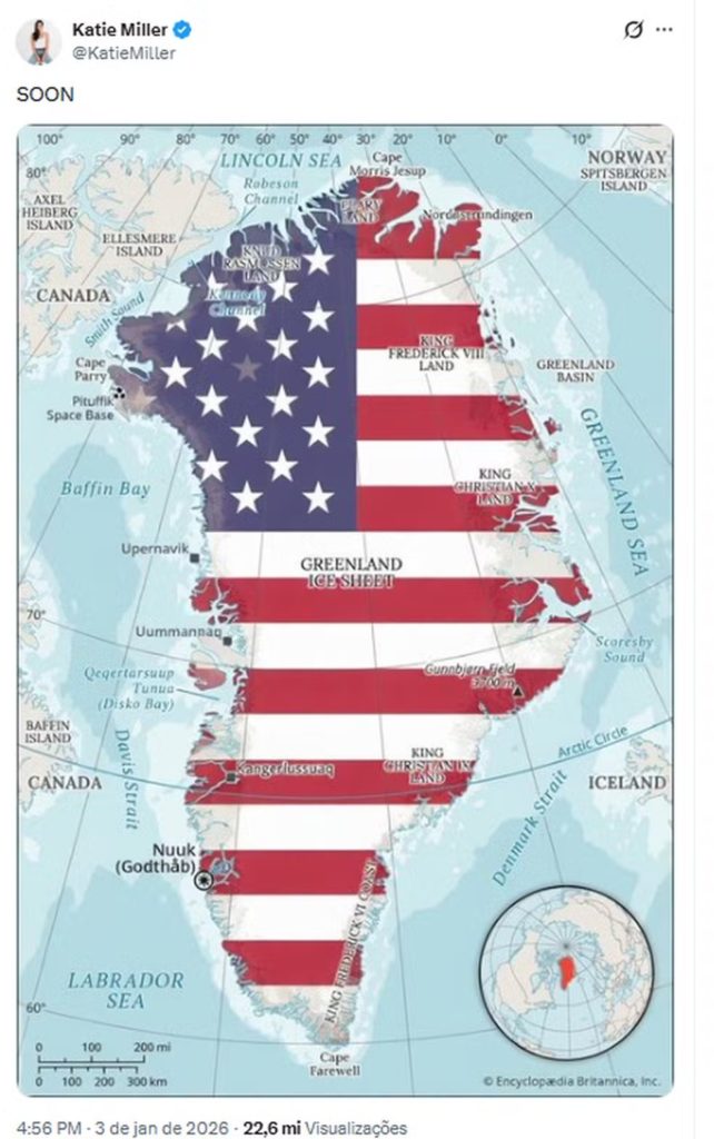 Publicações em redes sociais com mapas da Groenlândia cobertos pela bandeira dos EUA foram interpretadas como sinais de intimidação, ampliando o desgaste diplomático.