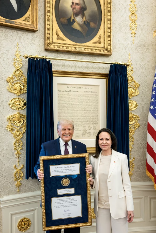 Em publicação nas redes sociais, o presidente declarou que Machado lhe entregou a medalha “pelo trabalho que tenho feito”, classificando o gesto como uma demonstração de respeito mútuo. A Casa Branca divulgou posteriormente uma foto do encontro, com Trump exibindo a medalha em uma moldura dourada, acompanhada de uma mensagem de agradecimento por sua “liderança extraordinária na promoção da paz por meio da força”.