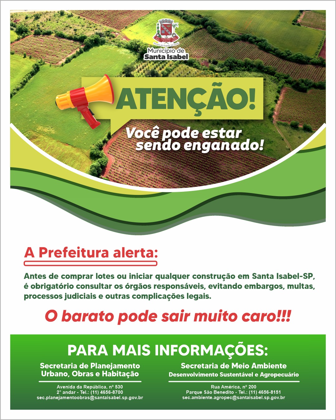 A Prefeitura de Santa Isabel reforça à população a importância de buscar informações oficiais antes de adquirir terrenos ou iniciar qualquer tipo de construção no município.