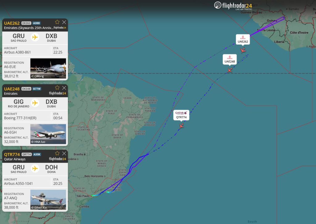 O voo EK262, da Emirates, que havia decolado de Guarulhos com destino a Dubai, precisou retornar quando já estava na costa africana, após o fechamento do espaço aéreo na região do conflito. Já o voo EK247 da companhia, operado por um Boeing 777-300ER, de matrícula A6-EGA, pousou às 16h29 no Aeroporto Internacional do Rio de Janeiro/Galeão, segundo dados da plataforma AirNav Radar, especializada em monitoramento global de voos.
