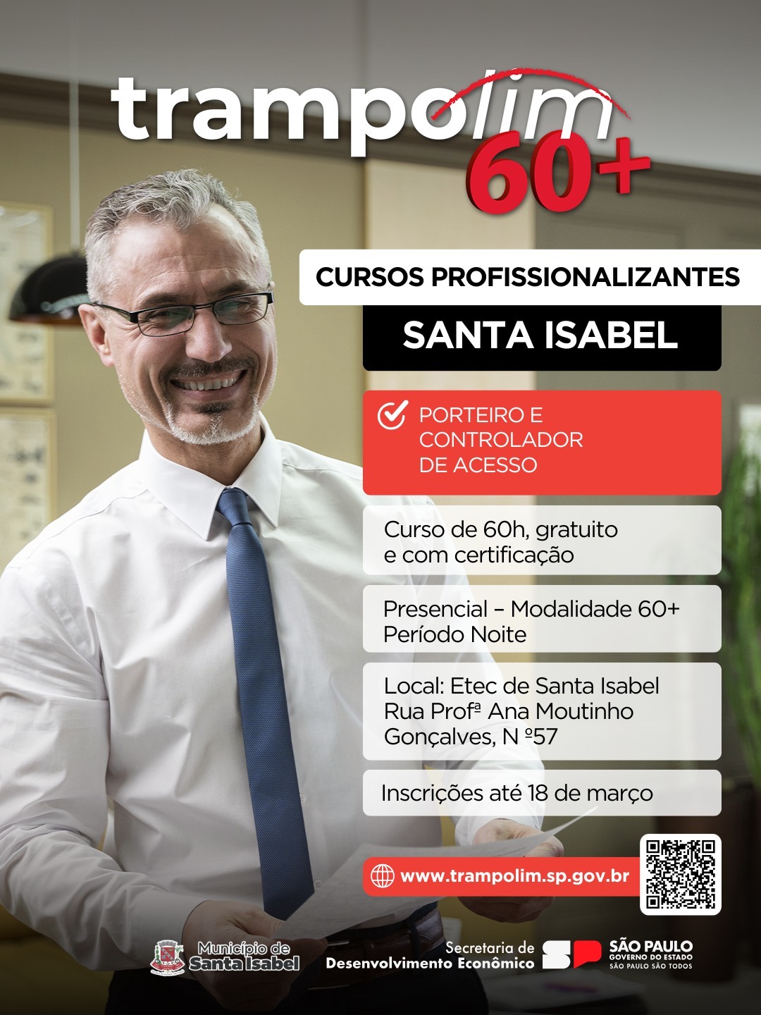 A Prefeitura de Santa Isabel abriu inscrições para um curso gratuito de Porteiro e Controlador de Acesso voltado ao público com 60 anos ou mais. A iniciativa é realizada por meio da Secretaria de Turismo, Empreendedorismo e Desenvolvimento Econômico, em parceria com o Programa Trampolim SP.