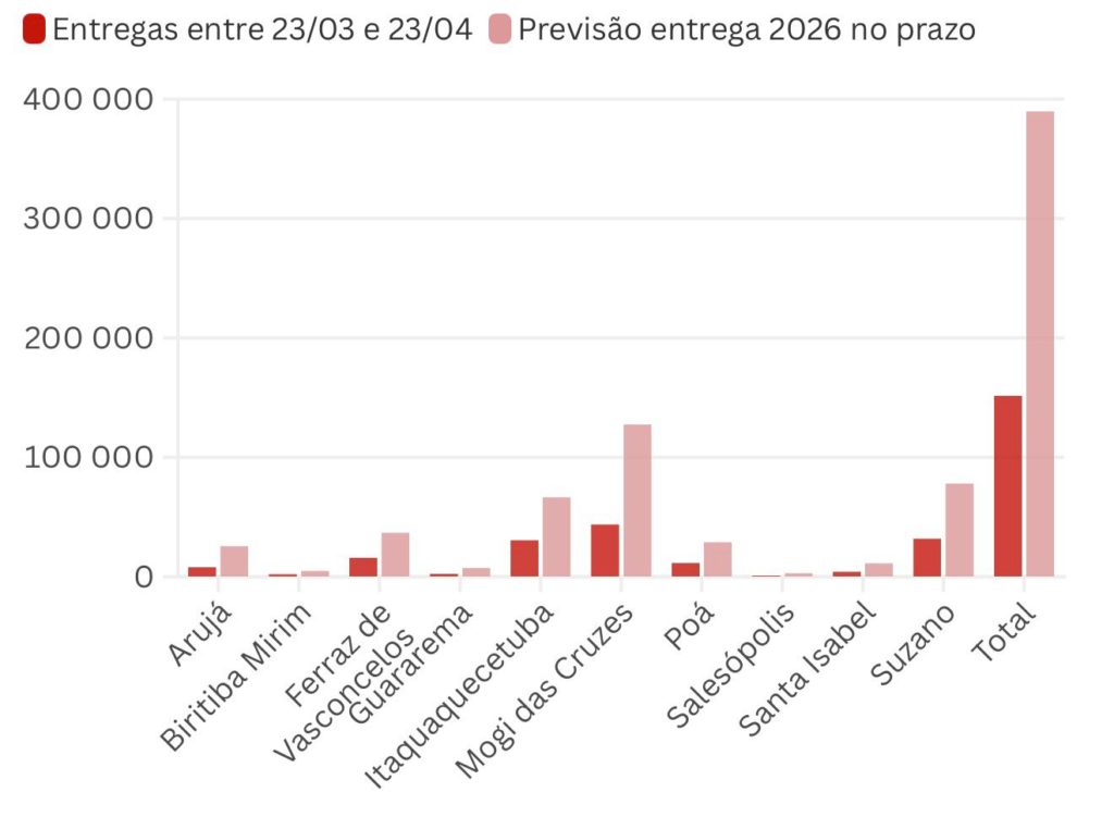 Entre os municípios, Itaquaquecetuba lidera em percentual de entregas, com 45,9% das declarações já enviadas — são 30.553 documentos de um total estimado de 66.491.