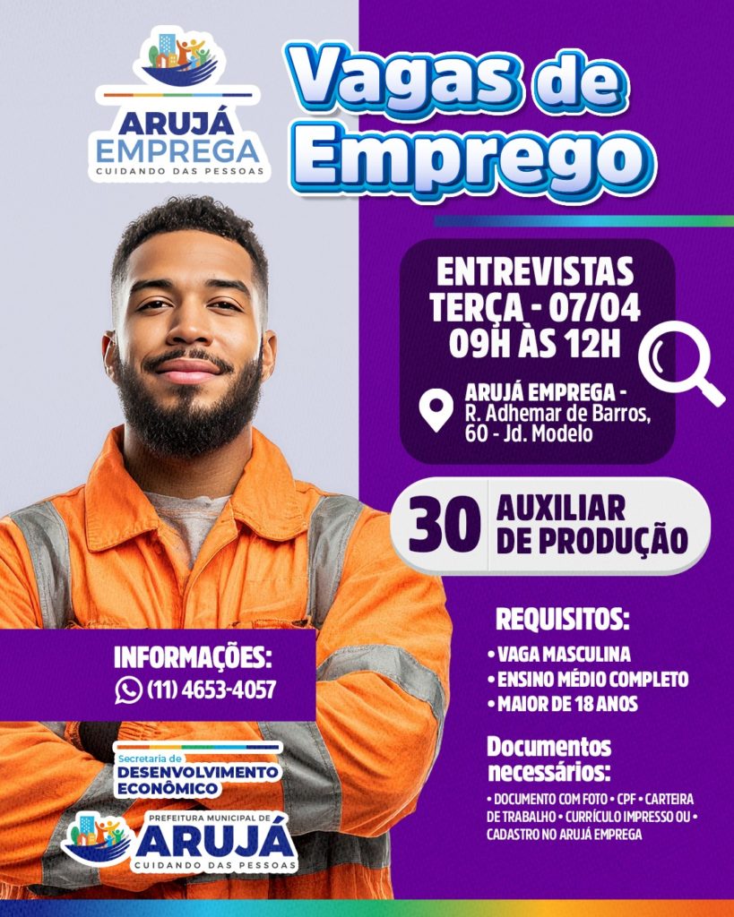 A Prefeitura de Arujá anunciou a abertura de um novo processo seletivo com foco na geração de empregos no município. Ao todo, serão disponibilizadas 30 vagas para o cargo de auxiliar de produção, com entrevistas marcadas para esta terça-feira (7).