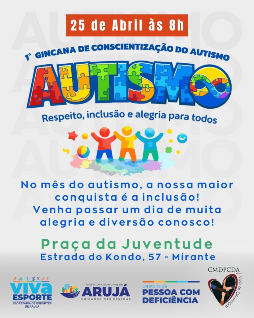 A cidade de Arujá recebe neste sábado (25) a 1ª Gincana de Conscientização do Autismo, um evento voltado à promoção da inclusão, do acolhimento e da convivência entre pessoas com Transtorno do Espectro Autista (TEA), seus familiares e a comunidade em geral.