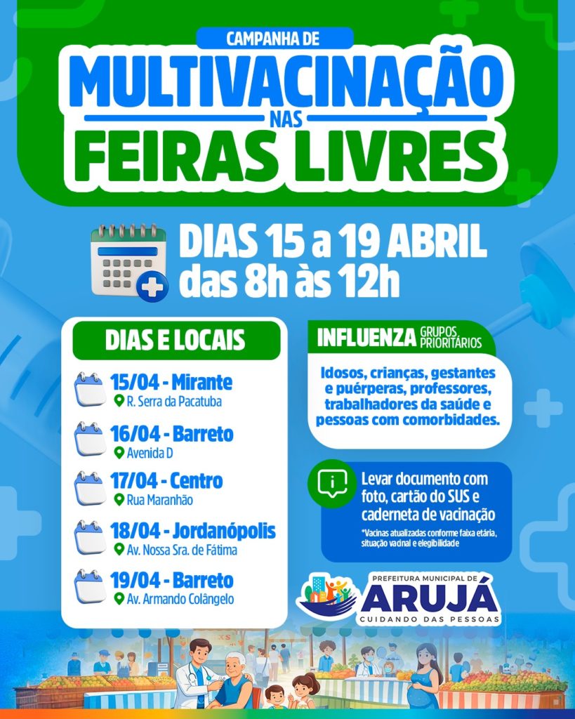 A Prefeitura de Arujá, por meio da Secretaria Municipal de Saúde, inicia uma mobilização estratégica de multivacinação itinerante com o objetivo de ampliar a cobertura vacinal e facilitar o acesso da população aos imunizantes. Entre os dias 15 e 19, equipes de saúde estarão presentes em diversas feiras livres do município, das 08h às 12h, realizando a avaliação e a atualização da caderneta de vacinação dos munícipes. A iniciativa busca alcançar o público em seus locais de circulação cotidiana, garantindo que a imunização ocorra de forma ágil e integrada à rotina da comunidade.